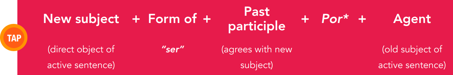 While the active voice has a subject that acts upon an object (e.g., María golpeó la silla), the passive voice has the subject acted upon (La silla fue golpeada por María). To change a sentence from the active voice to the passive voice, the direct object of the active sentence becomes the new subject. The old subject of the active sentence becomes what is called “the agent.”